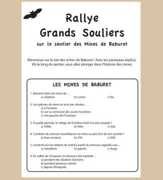 En el camino de las minas de Baburets a Ferrières Gracias a este pequeño folleto, será fácil combinar caminata y descubrimiento. Descargue e imprima este folleto para que sus hijos puedan marcar con un círculo las respuestas correctas a las preguntas y descubrir la respuesta al último enigma al final.