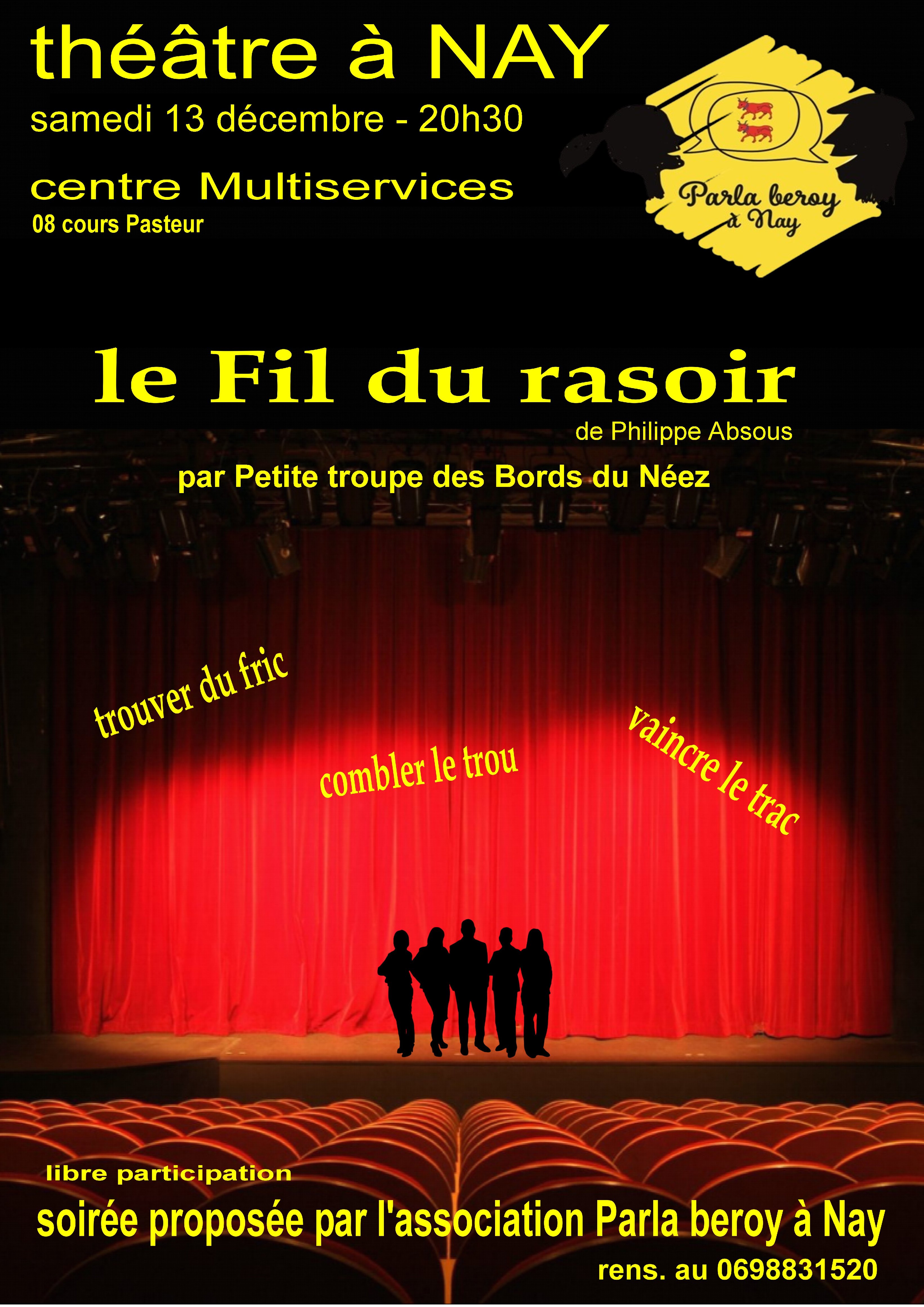 Descriptif général : Une pièce de théâtre intitulé "LE FIL DU RASOIR" de Philippe ABSOUS, jouée par la petite troupe des bords du Néez.