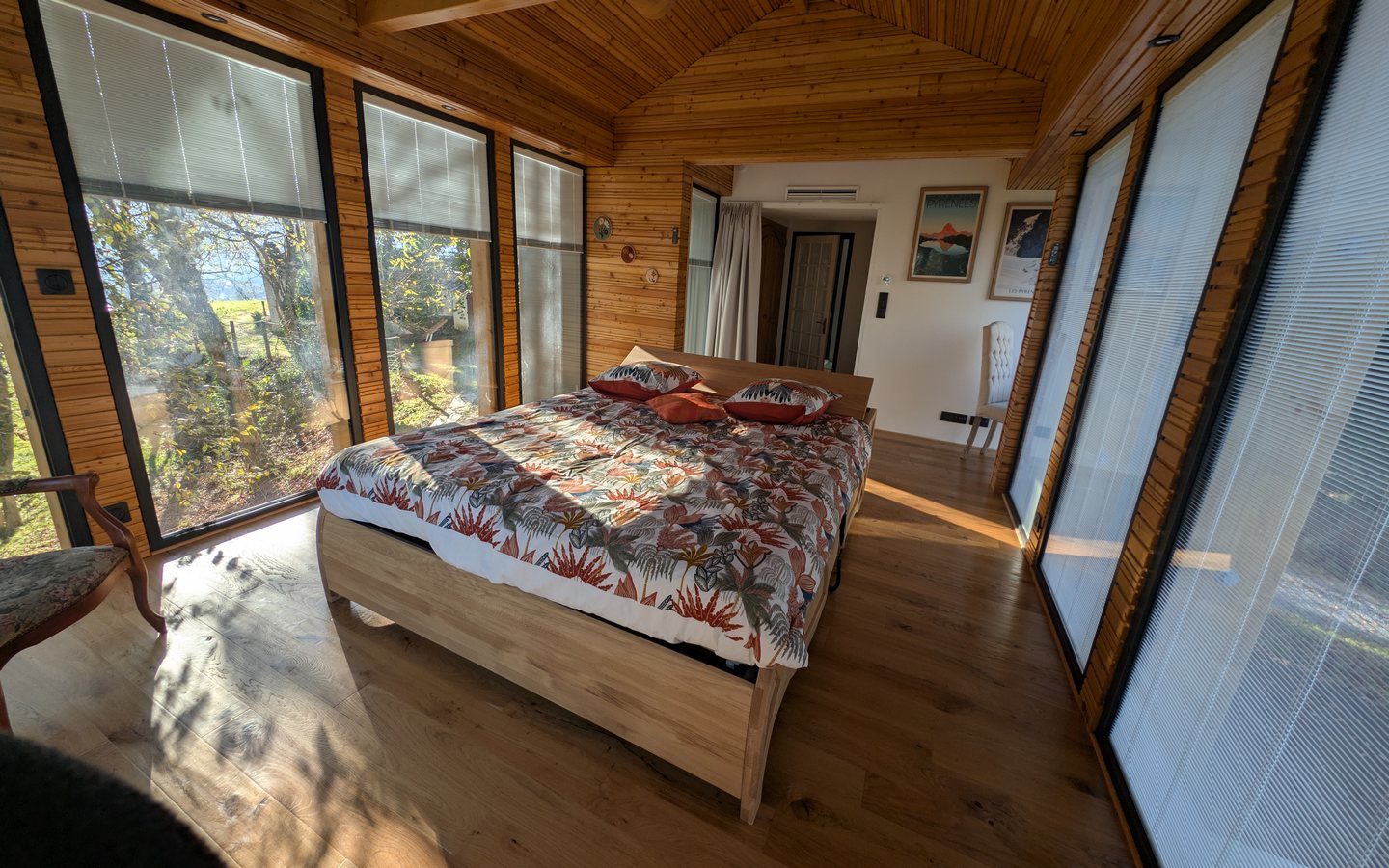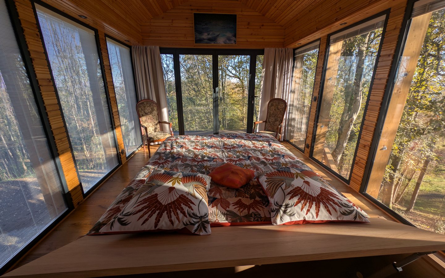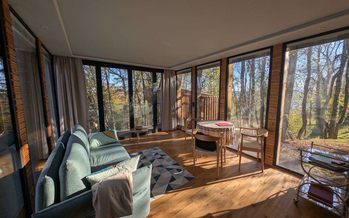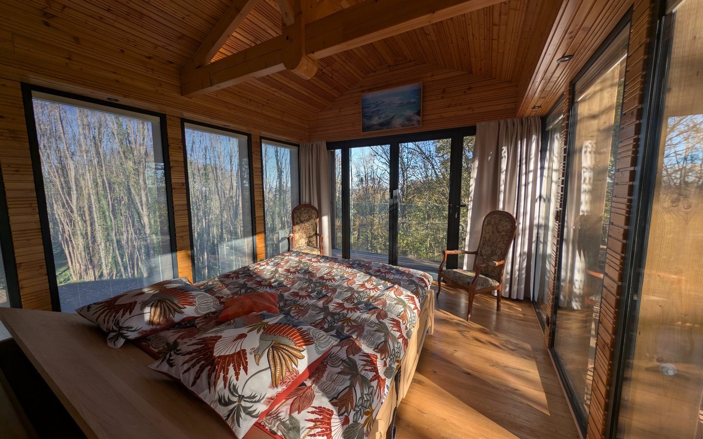 L’hébergement brille par son design contemporain, mariage parfait entre le bois massif et d’immenses baies vitrées qui unissent avec élégance l’intérieur et la nature environnante.